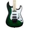 A Seymour Duncan JB TB-4 humbucker in the bridge adds plenty of upper midrange attack, with a tight, articulate low end and harmonically rich highs. Samarium Cobalt Noiseless Single-Coil Strat middle and neck pickups deliver authentic, noise-free Stratocaster snap with incredible dynamic and magnetic response. A five-way blade selector switch along with single volume and tone controls open up endless tonal possibilities, while the Floyd Rose Original double-locking tremolo system keeps the guitar in tune through the roughest playing, set after set. Groomed for high-performance and speedy playability, this signature axe is wrapped in a striking Transparent Green Burst finish with white pickguard, black hardware and licensed Fender Strat headstock.