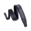 2 1/2″ Chrome-tan Leather Guitar Strap With Garment Leather Backing and Authentic Amplifier Grill Cloth with Metallic Thread Embedded Under Three Piece Cut Out Design. Padded and Adjustable from 43″ to 56″. Black Chrome-tan Color with Black Metallic Grill