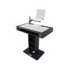 The T-shaped DJ Controller podium is manufactured in Poland and made from the highest quality materials in Europe. Top-quality birch plywood finished with white warnex textured paint. The inside of the control deck is lined with high-density foam that stabilizes and secures your controller firmly into the control deck. Place your laptop on the secure tray attached to the included boom arm that can tilt, swivel, rotate, raise, and lower to your desired position. The podium center is equipped with three-tier shelves (for utility storage, mics, cables, etc). There are pre-drilled holes in each shelf to allow power and audio cables to pass through from the controller down to the base area.