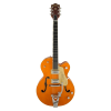Designed for pure tone and slick, comfortable playing feel, this guitar features the classic aesthetics true Gretsch fans love—nickel G-arrow control knobs, aged white binding with black purfling, durable gloss nitrocellulose lacquer finish, aged pearloid thumbnail inlays, gold vintage thick plexi pickguard with Gretsch logo and nickel Grover Sta-Tite tuning machines. Elegant style and refined sound combine to make the G6120T-59 Vintage Select Edition '59 Chet Atkins Hollow Body with Bigsby a Gretsch aficionado’s dream guitar.