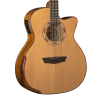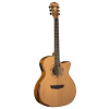 The G66SCE Spalt Maple is a Grand Auditorium style acoustic/electric guitar with a Venetian cutaway for superior upper fret access. A highlight of the Comfort Series is the deluxe re-curve style ergonomic armrest bevel at the lower bout which becomes part of the mahogany top binding. The guitar features a solid Western Red Cedar top and Spalted Maple back and sides, mahogany/maple bound body and head stock. The satin finished mahogany neck has an Ovangkol fingerboard devoid of inlays and in tandem with the mahogany bound Ovangkol bridge adds an aura of understated elegance. A maple/mahogany/maple strip splits the book matched Spalted Maple back as well. The headstock features a mother-of-pearl Washburn logo and 18:1 ratio tuners. The Washburn Parquet style rosette is made of alternating maple and mahogany.