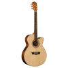 The Harvest Series G7SCE is the acoustic-electric companion to our G7S and features the same Solid Spruce top and Select Mahogany back and side pairing. The solid top and quarter sawn, scalloped Sitka Spruce bracing help define note clarity throughout the entire register of the instrument, making it unparalleled in it’s price range. The satin finished mahogany neck feels great in the hands and makes for ease while playing. The cutaway body design allows for easy upper fret access. Our attractive “Washburn Heritage” rosette, gloss finish Grand Auditorium body and choice Ovangkol for the bridge and fingerboard material add to the pleasing aesthetics of the overall instrument. The Barcus-Berry EQ4T preamp allows for instrument amplification and features a 4-band EQ, built-in tuner and notch dial for refined tone while plugged in.